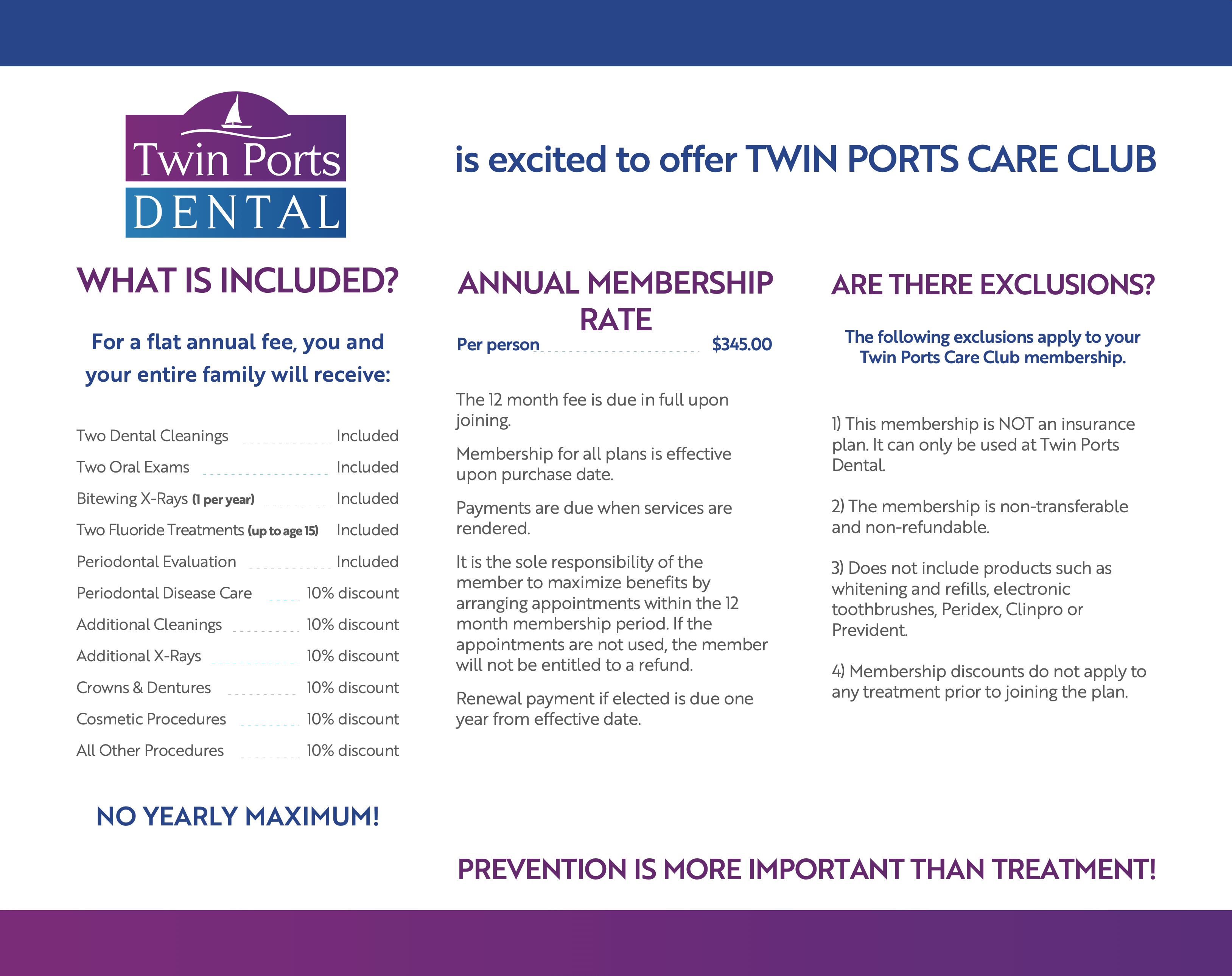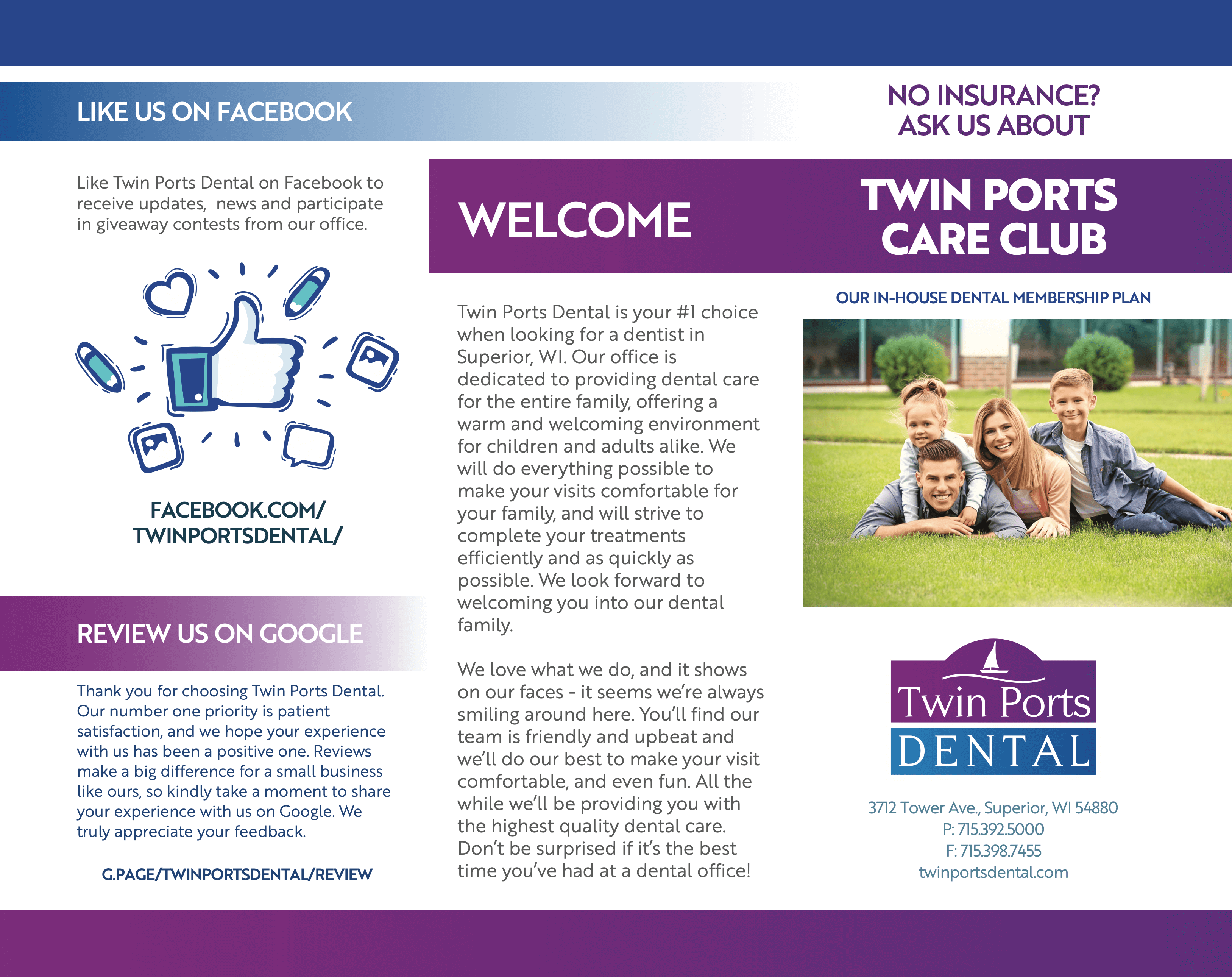 Download our brochure below or give us a call about our Dental Care Club, Twin Ports Dental’s in-house dental care membership. We look forward to hearing from you!