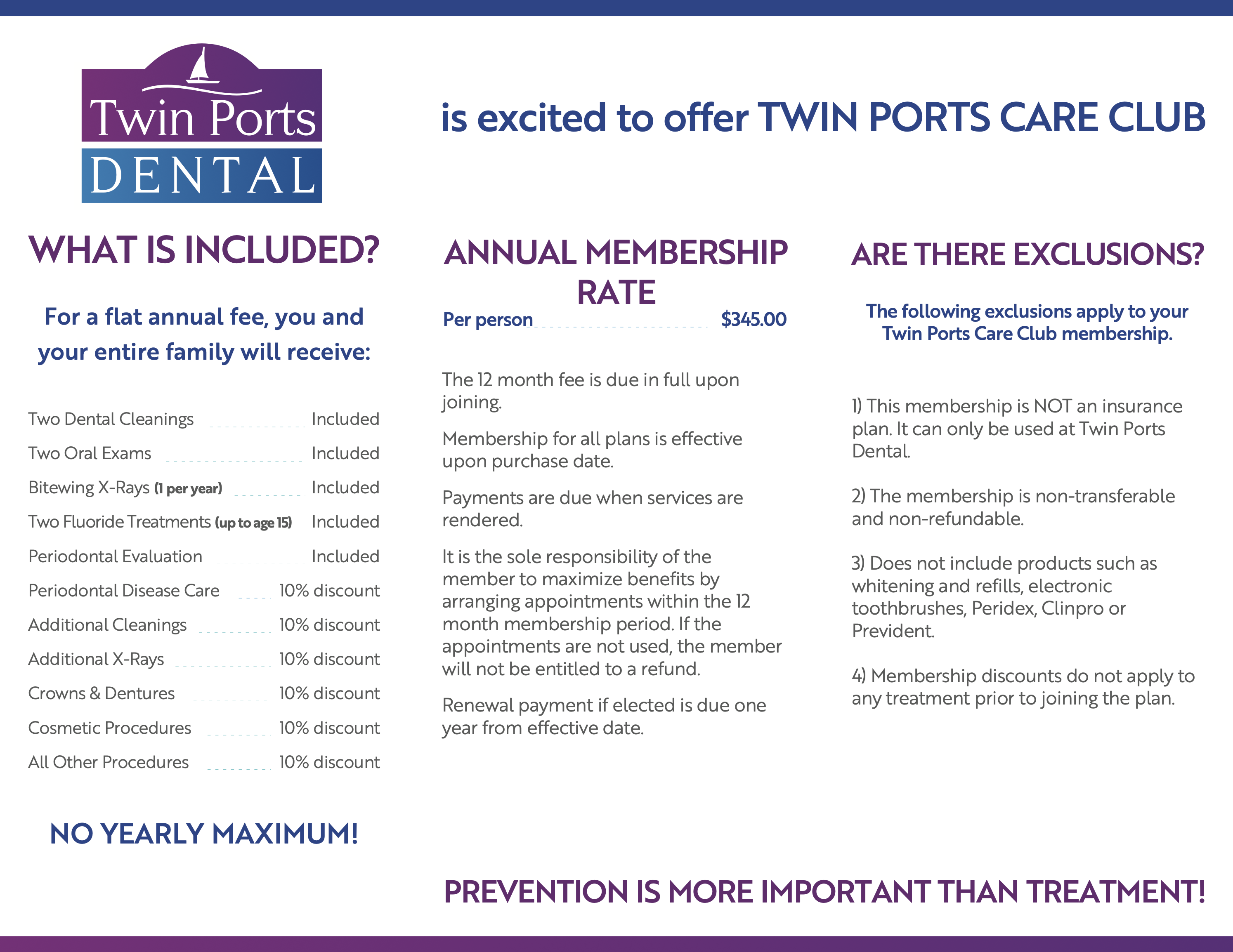 Twin Ports Dental is excited to announce our new in-house dental care program. For a flat annual fee, you and your entire family will receive your dental cleanings, oral exams, x-rays, fluoride treatments and more. We also offer crowns, dentures, and other procedures at a deeply discounted rate.
